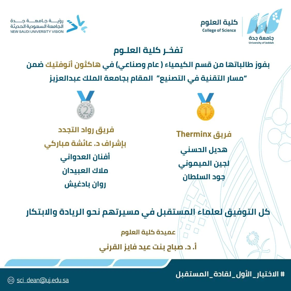 تفخر كلية العلوم بفوز طالباتها من قسم الكيمياء (عام وصناعي) في هاكثون أنوفتيك ضمن مسار التقنية في التصنيع المقام بجامعة الملك عبد العزيز