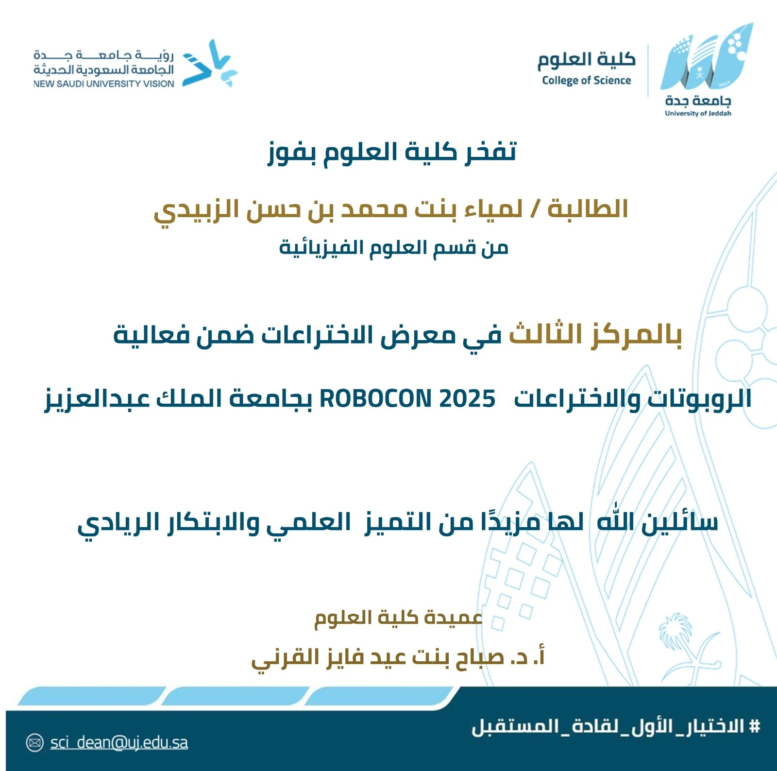 تفخر كلية العلوم بفوز الطالبة/ لمياء بنت محمد بن حسن الزبيدي من قسم العلوم الفيزيائية بالمركز الثالث في معرض الاختراعات ضمن فعاليات الروبوتات والاختراعات
