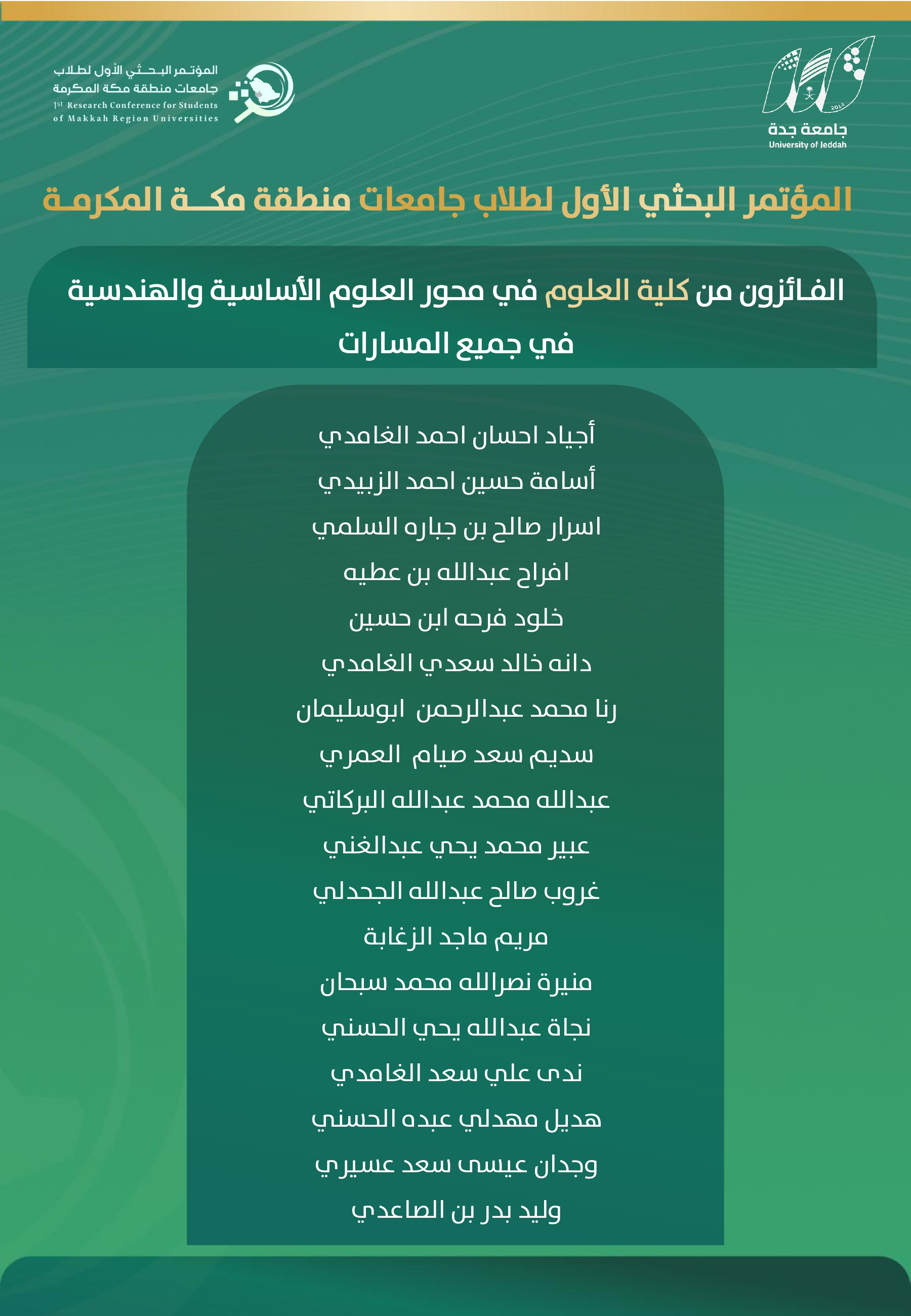 الفائزون في المؤتمر البحثي الأول لطلاب جامعات منطقة مكة المكرمة في محور العلوم الأساسية والهندسية في جميع المسارات