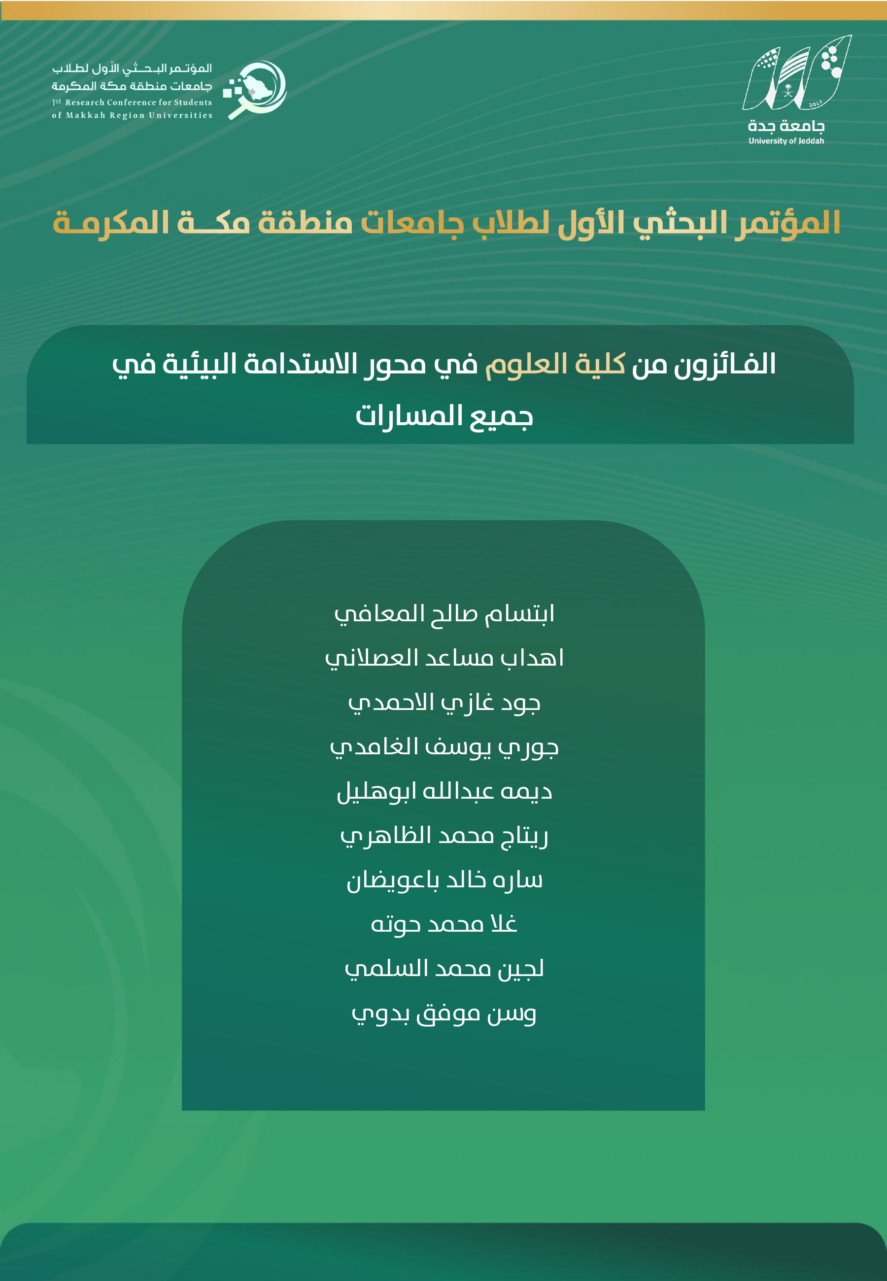 الفائزون في المؤتمر البحثي الأول لطلاب جامعات منطقة مكة المكرمة في محور الاستدامة البيئية في جميع المسارات