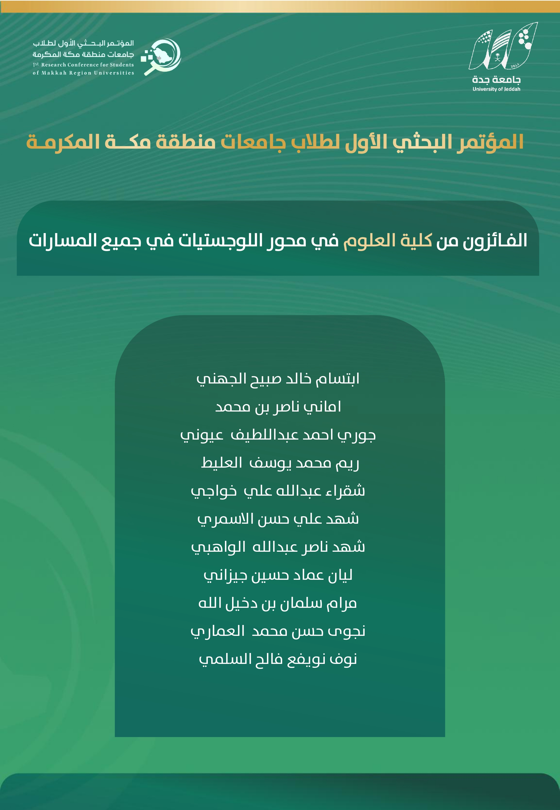 بكل فخر واعتزاز نبارك لطلاب وطالبات كلية العلوم فوزهم وتميّزهم المستحق في المؤتمر البحثي الأول لطلاب جامعات منطقة مكة المكرمة في محور اللوجستيات في جميع المسارات.