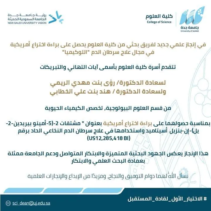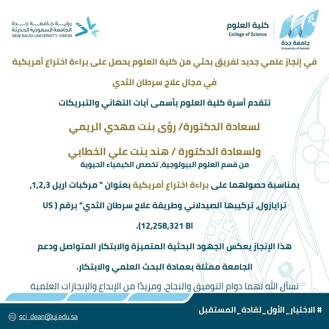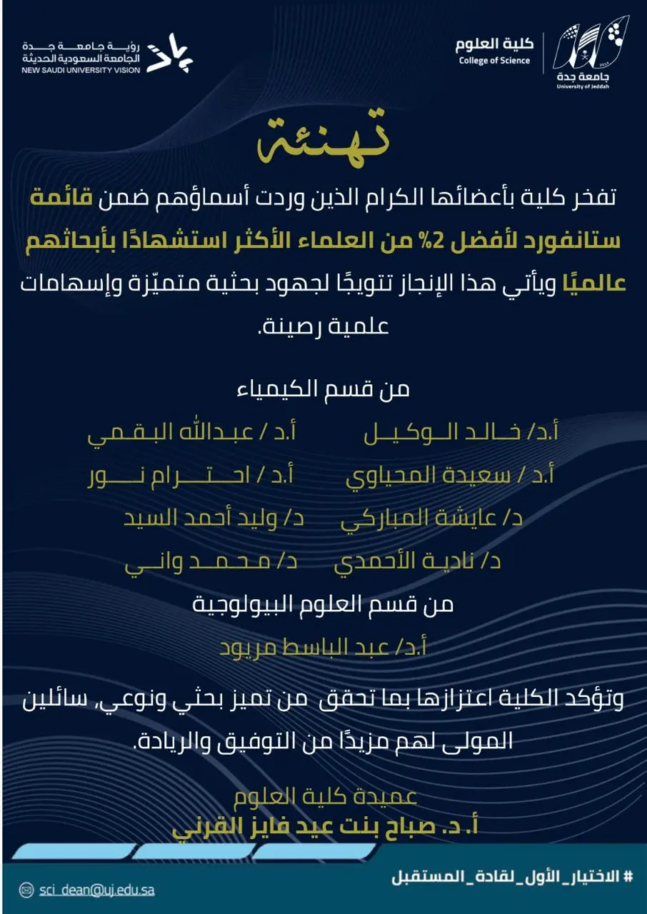 The College of Science has taken the initiative to apply modern technologies in the educational process and electronic tests to keep pace with global scientific development. The college also seeks to improve the quality of education by using innovative educational tools and enhancing the digital learning experience, which contributes to preparing students to face the challenges of the modern era. The college is constantly working to achieve the goals set by the university, in line with its vision and mission, and to contribute to making Jeddah University one of the leading universities at the local, regional, and international levels, thus contributing to achieving the vision of the Kingdom of Saudi Arabia 2030. In addition, the college focuses on enhancing academic cooperation with local and international scientific research institutions, which contributes to the exchange of knowledge and expertise and helps in developing joint research projects. It also seeks to provide advanced training programs for students and faculty members, intending to raise the level of academic and administrative skills in line with market needs and scientific developments.